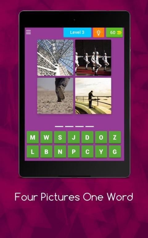 The most popular word game around. Challenge your cognitive skills and test your vocabulary in a timeless manner. Guess the word from the four pictures given. Suitable for all ages. Play any time and lose yourself in the amazing world of words and pictures. A total of 230 EXCITING LEVELS available.