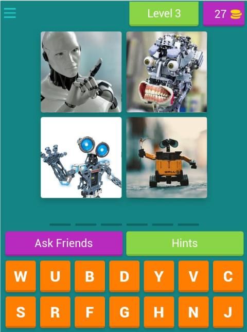 Ini adalah permainan interaktif di mana Anda mendapatkan 4 foto dan Anda harus menebak satu kata yang ditentukan oleh gambar itu. Saya menantang Anda untuk mengalahkan level 5!