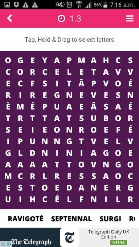 Petunjuk permainan dan menu yang menulis dalam bahasa Inggris tetapi tujuan Anda adalah untuk menemukan kata-kata Perancis antara surat-surat bergegas dari daftar di bagian bawah layar. Anda kemudian hanya menyorot dan beralih ke Firman Perancis berikutnya.
