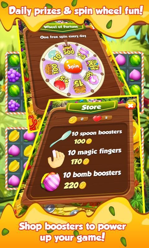 Anda memenangkan hadiah acak sekali sehari dengan memutar Wheel of Fortune secara GRATIS. Selain itu, Anda dapat membeli lebih berputar dengan koin dalam game untuk mendapatkan lebih banyak hadiah. Hadiah meliputi: spin gratis, 15, 100 atau 500 koin, 5 hidup bebas, 3 bergerak ekstra, 10 penguat, dan akhirnya JACKPOT!