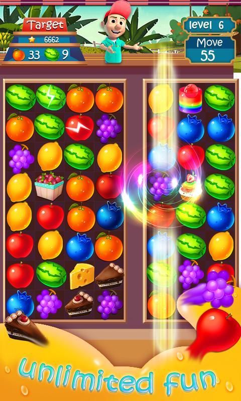 Menyelesaikan misi dalam gerakan terbatas, cocok 3 atau lebih lucu buah dengan warna yang sama secara vertikal, horizontal atau diagonal.