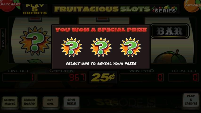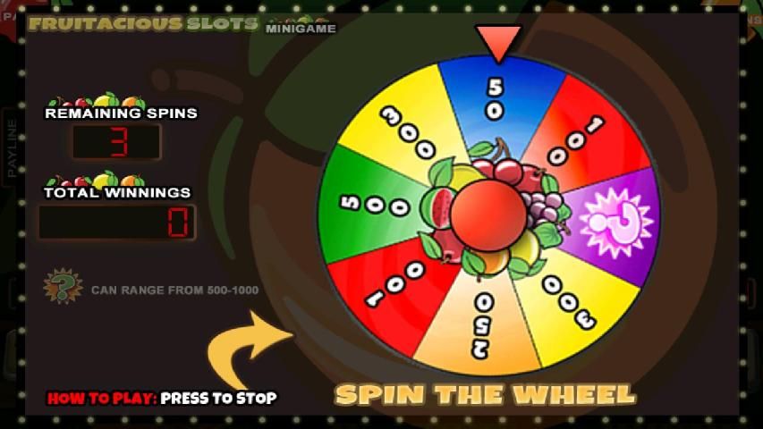 Kami baru saja menambahkan mini game baru dalam edisi baru 2.0 dari Fruitacious Slots. Kisaran hadiah adalah 50-1000 kredit. Ketika Anda mendarat di mini game kami, Anda memiliki tiga kesempatan untuk memenangkan hadiah jackpot yang utama yang menjamin Anda pergi dengan 500 atau lebih!