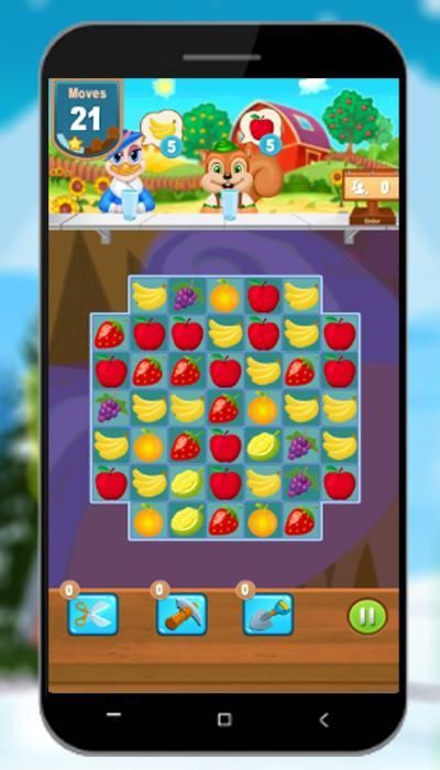 - Hanya mencocokkan tiga atau lebih buah identik yang sama untuk mencetak poin.