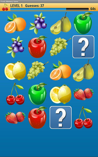 Fun and easy fruits memory game,improve your memory skills with fruits memoryFruits Memory Games One of the funnest memory game to play and free to download and enjoy quality game experience with the best fruits memory game with sharp icons of 3D fruit. Memory games are good practice for any age, The use of fruits in memory games are very popular as its very familiar pictures to ours brains memory. And thats what makes it more easy and fun to play with fruit in memory game. It39;sfantastic game where memory is the challenge using fruit symbols as a means of fun and excitement and training those highly valued cognitive skills that shapes the minds of today and tomorrow. Fruits that used in our memory game are : Green Apple, Red Apple, Orange, Grapes, Cherries, Blueberry, Strawberry, Pear, Banana, LemonFRUITS MEMORY GAME FEATURES:Excellent fruit graphics that are sharp and crisp so that the player will know which fruit symbol is which and not have to strain themselves.Fun sounds to carry you along playing Fruits memory game and limited to keep you on developingyour brains memory to remmember where the fruit symbols are and match them a pair. 3D Icons Touch Screen Sounds onoff options Vibrate onoff option Level difficulty based on time Automatic High ScoresWHY YOU SHOULD GET FRUITS MEMORY GAMEThis Fruit Memory Game is important for many reasons.The primary reason is because it is a memory improvement game where simple yet complex cognitive memory is tested.Both long and short term memory and other cognitive abilities are put to the test in a non invasive way.The simple symbols allow for the player to see them clearly and recall their configurations and see the results right then and there.This is the kind of testing and gaming that has value according to numerous studies showing that video games that are of a design and engineering where higher cognitive functions are challenged actually enhance the brain and the neurons.This is a benefit of all endeavors that are challenging but now with video games that effect has brought about new ways to produce games and more. This app is a branch off of the earlier video games that brought about such challenges and fun that people would get addicted.Now these games can be translated into apps like this memory game.Now here39;s something that you just can39;t get away from.The fun of these games are such that they quickly become the primary form of entertainment for app users and that can be good.This app isn39;t some mindless game where you run around shooting people, this is a game for kids and adults who are young at heart.Kids can play this game at home or on those long road trips.They39;ll get a kick out of trying to solve this fruity fun and teachers can use it to see how the child39;s cognitive development grows.Parents don39;t have to worry about any violence in this app.It39;s just the kind of family natured fun designed for kids that doesn39;t have offensive sounds, sights or anything.With today39;s parenting computing technology you might even want to record some of your child39;s game play so you can see how fast your child adapts.These recordings are of great value especially if you take pride and concern in your child39;s cognitive development.If you39;re not that serious then you can watch as the kids play this game and have all kinds of fun.While they39;re playing it you can bet they won39;t be getting into any trouble either.So all in all you have a simple game that using advanced but user friendly game play strategies that test the cogni