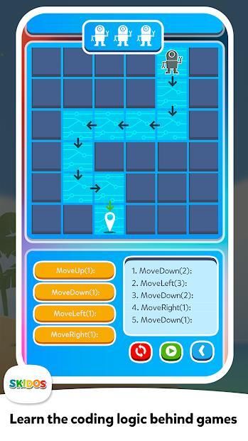 Semua game SKIDOS memiliki 20 level tentang cara memindahkan objek, yang membantu anak-anak memahami logika permainan coding.