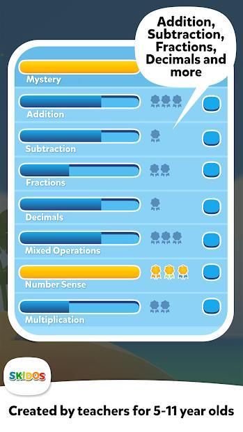 Semua konten pembelajaran dalam permainan SKIDOS disesuaikan dengan standar nasional untuk Matematika dan mencakup daftar topik yang komprehensif.