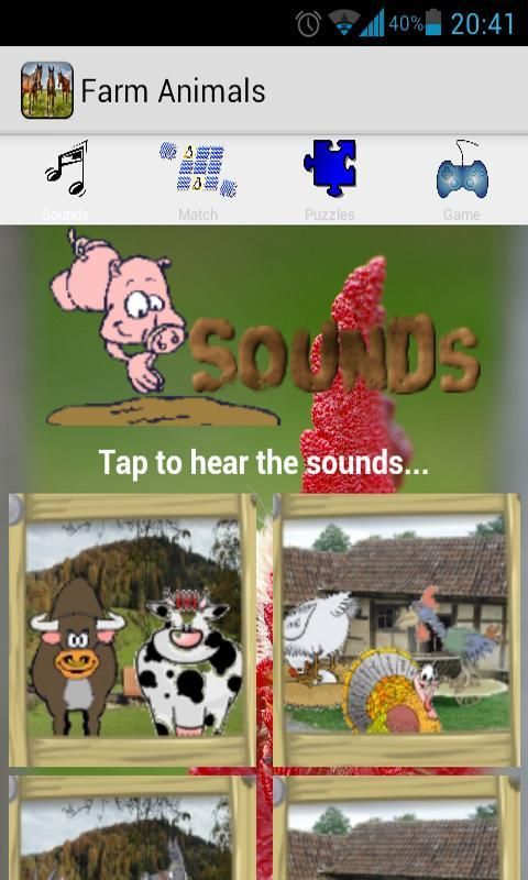 Dirancang untuk 2 tahun ke atas. Gameplay sangat sederhana dan cocok untuk anak-anak yang lebih kecil - ketika suara binatang ternak dimainkan, anak Anda perlu menyentuh gambar ramah hewan yang benar.