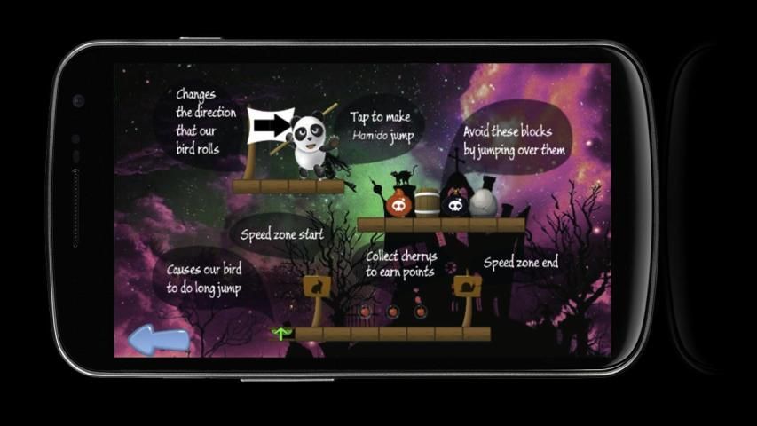 Dalam perjalanannya di sebuah rumah penyihir berbahaya, yang penuh dengan pepohonan hijau, pegunungan, air dll ia mengumpulkan barang peledak khusus power-up, ceri, api, stroberi, koin dll untuk meningkatkan kekuatannya. Anda hanya perlu menyentuh layar Anda untuk membuat dia melompat sehingga ia dapat menghindari hambatan seperti lubang, perangkap, serangga dll Hati-hati bom!