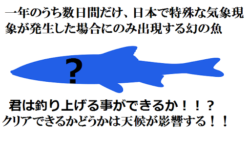 Ada 11 jenis ikan yang bisa ditangkap dalam permainan. Situs Beberapa hari, seekor ikan yang dapat ditangkap di tempat tertentu ketika fenomena meteorologi yang merupakan kepulauan Jepang hanya terjadi selama beberapa hari dalam setahun. Situs seperti ikan apa yang harus memeriksa diri sendiri. Situs -----