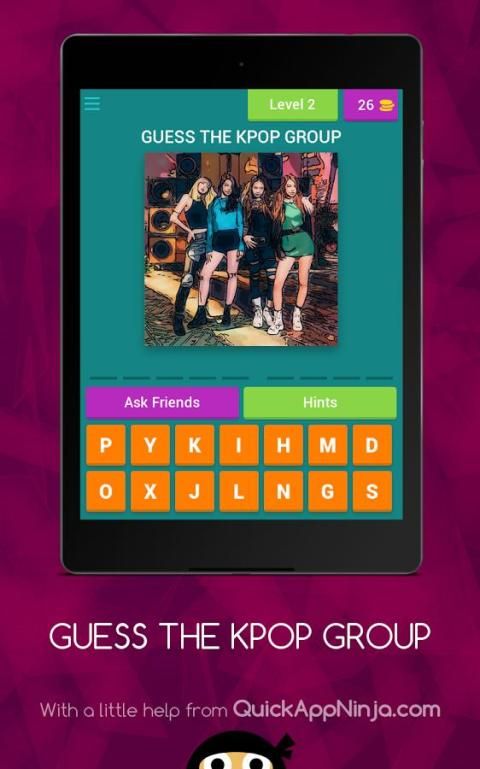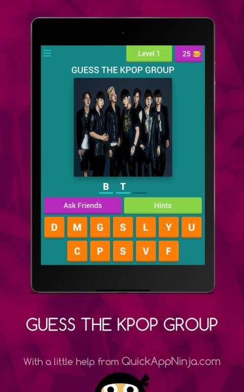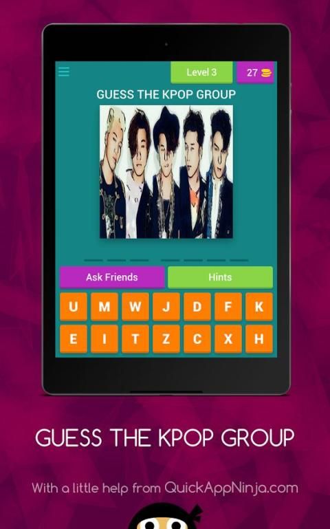 Mengapa tidak menempatkan pengetahuan Anda untuk tes? "Tebak The KPOP Group,” adalah permainan menebak yang memungkinkan Anda untuk mengetahui berapa banyak penggemar sejati Anda sebenarnya. Untuk memainkan mudah, melihat foto, mengatakan siapa di layar, dan beralih ke gambar berikutnya . Hal ini dijamin untuk menantang otak Anda. beberapa gambar yang mudah dan ada juga yang tidak. Tujuannya adalah untuk mendapatkan ke tingkat berikutnya. Jangan khawatir. Kami menyediakan Anda dengan petunjuk untuk membantu Anda untuk memecahkan gambar. Anda dapat menggunakan petunjuk seperti (Full Surat Show) dan (1 Surat Show) dengan koin Anda. hati-hati, “Tebak The KPOP Group,” dipandang sebagai sangat adiktif. Tapi jika Anda membuatnya melalui semua tingkat, Anda memang bENAR K - POPPER!