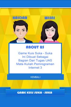 Game Kuis Suka Suka adalah game kuis yang dibuat untuk mengisi waktu luang kamu, berisikan pertanyaan-pertanyaan simple dan tidak rumit, sedikit mengasah otak kamu untuk berfikir. Dengan game kuis ini kamu akan ditantang mengisi setiap pertanyaan dengan jawaban yang tidak sesuai dengan pilihan kamu, melainkan sesuai dengan pilihan pembuat, namanya juga Game Kuis Suka Suka.