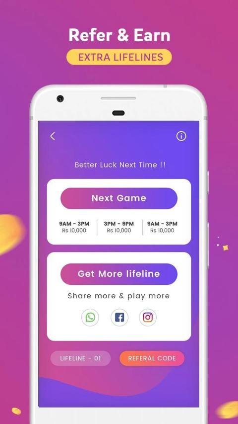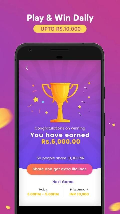 Refer all your friends to earn extra lives. Real Money prizes range start from Rs 10,000 and keep going up depending on the total number of people playing!