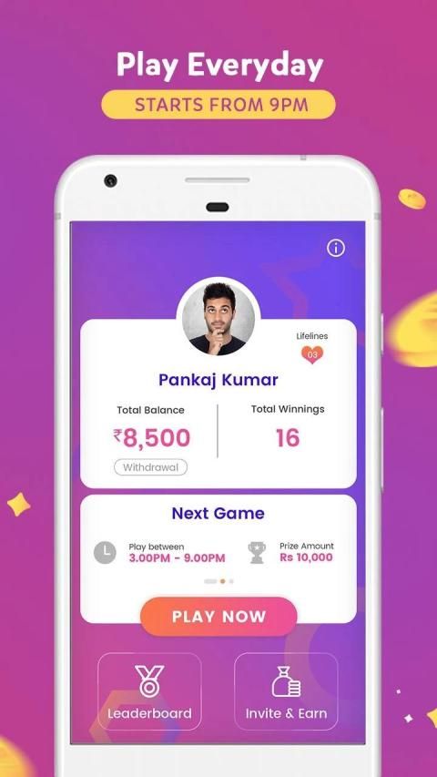 Merujuk semua teman Anda untuk mendapatkan kehidupan ekstra. hadiah uang nyata jangkauan mulai dari Rs 10.000 dan terus naik tergantung pada jumlah total orang yang bermain!