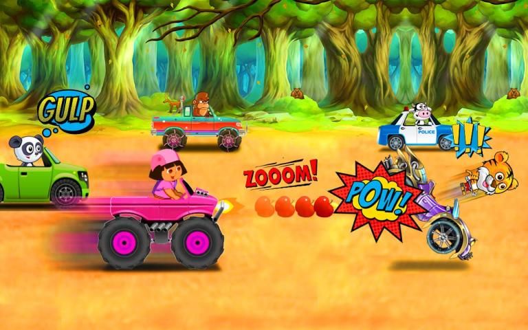 Bermain sebagai gadis petualangan, mempercepat akselerasi Anda, menyalip pembalap hutan lainnya, menembak buah terhadap mereka!