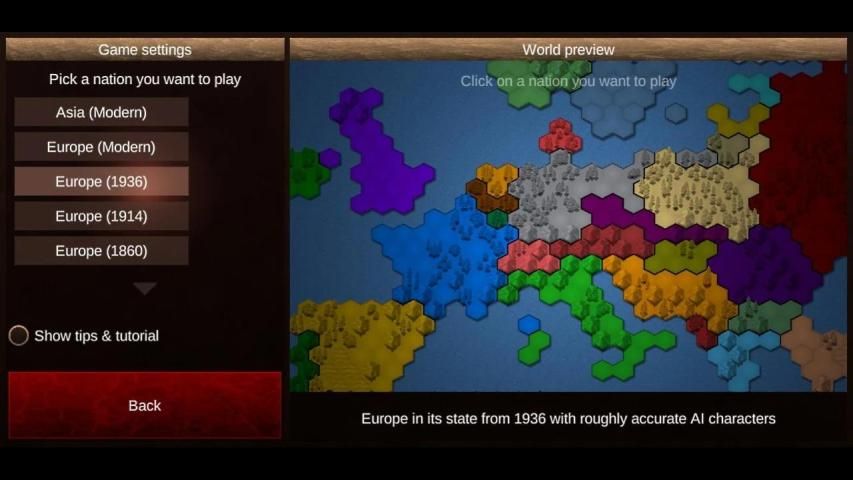 Playable scenarios: Randomly generated map with adjustable size, Africa, American continent, Asia, Europe, Europe (1936)
