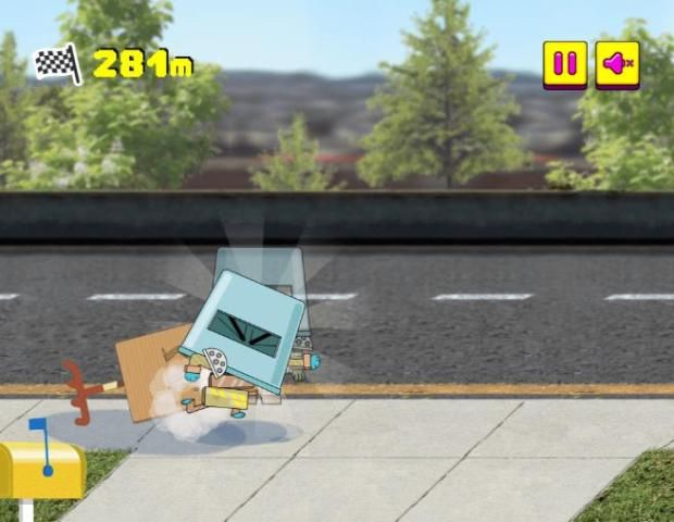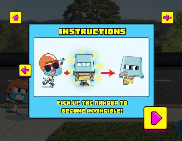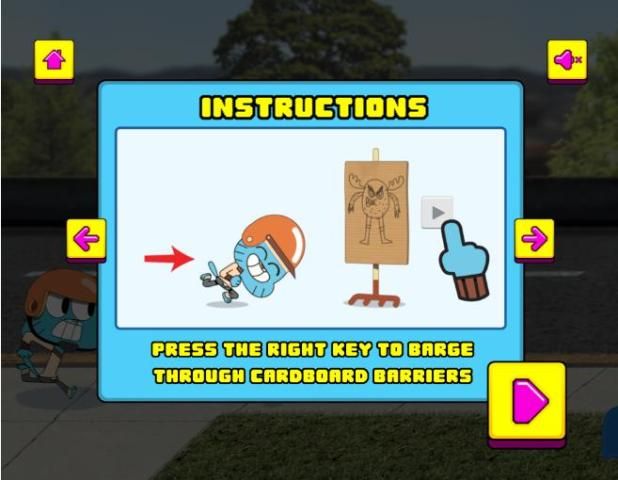 Tap “up” to jump over the bicycles, the pots, the cereal boxes, and all the other objects that stand in Gumball’s way. Double tap on it to perform a double jump if the objects are too tall. Be careful not to hit your head in the objects that are tied up above the street. If you come across some cardboard barriers, Tap in the left to take them down.