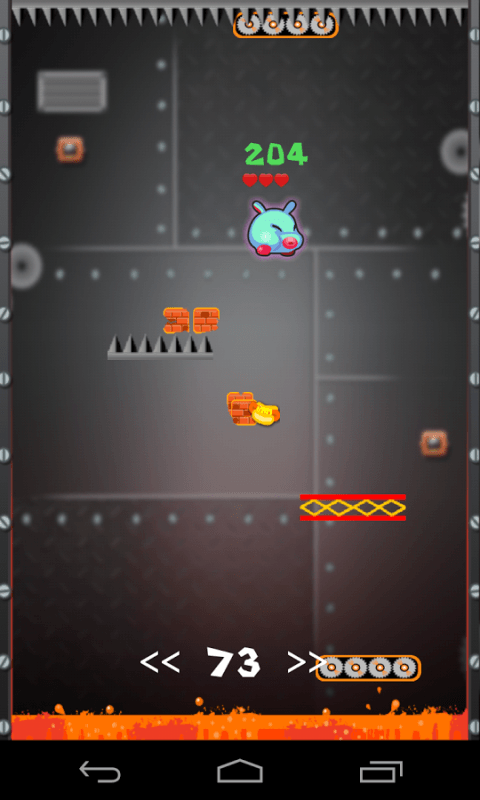To add to that challenge there’s the platforms; some are static, some are spring, others are rotating conveyors that push you off, then there’s spiked platforms that deduct HP from the piggy, while some crumble as soon as you land on them.