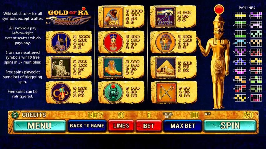 Emas Dari RA Slot Machine adalah kegembiraan Las Vegas dan Mesir kuno di saku Anda, pengalaman perjudian nyata. Merasa beruntung? Memukul jackpot! Pilih berapa banyak kredit dan garis Anda ingin bertaruh dan klik SPIN!