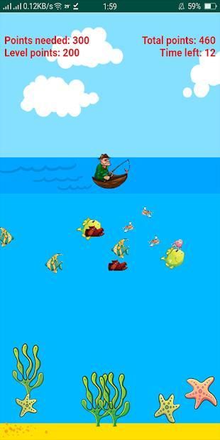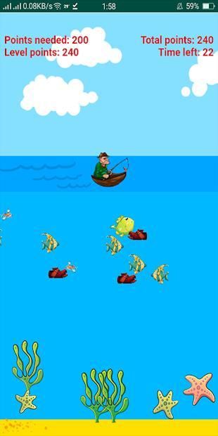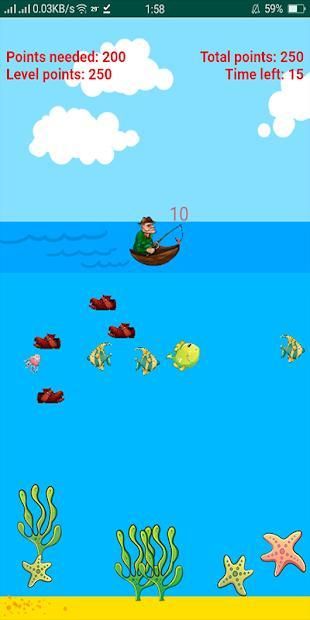 Gone Fishing goal is to catch as many small and big fishes to earn big points. Catching a shoe can still earn you points but try to catch the big fishes for bigger points. You need to reach or exceed required points for each level before you run out of time.
