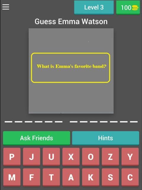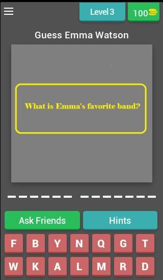 Jika Anda tidak dapat mengenali Emma Watson Profil, jangan khawatir! Anda memiliki koin sebagai kredit untuk mendapatkan petunjuk bahkan menjawab pertanyaan.