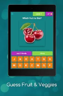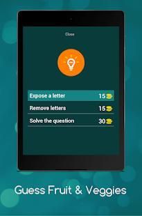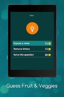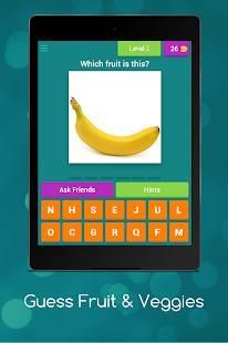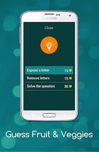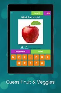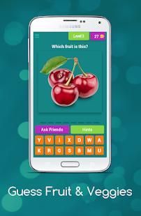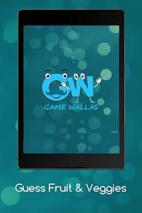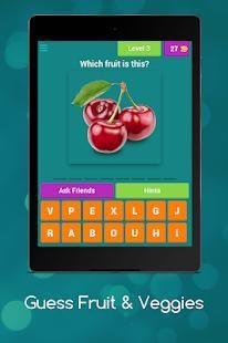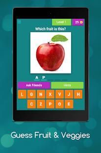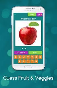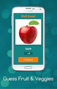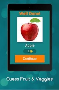 Dengan bantuan Guess buah-buahan dan sayuran anak aplikasi akan akan belajar nama-nama beberapa buah-buahan dan sayuran, di tingkat awal sangat gambar umum dari buah-buahan akan muncul dan Anda harus menebak nama gambar itu, setiap tingkat berisi gambar buah dan sayuran bersama dengan gambar beberapa kata akan diberikan kepada pengguna dari surat-surat pengguna harus memilih ejaan yang benar dari buah dan sayuran tertentu, dalam kasus bantuan Anda dapat menghubungi kami di email yang disediakan.