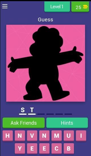 Ini adalah permainan trivia tentu saja di mana Anda hanya harus menebak dengan benar nama karakter Steven Kartun Universe besed dari gambar aliran yang muncul di setiap tingkat dengan mana Anda akan harus mengatasi tingkat berhasil atau Anda bisa mendapatkan bantuan.