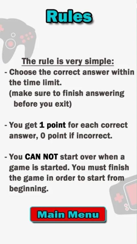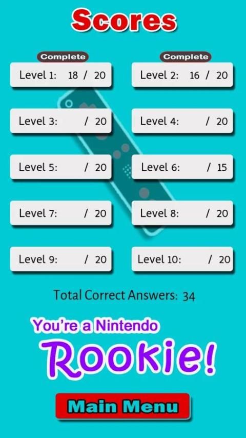 Tebak Nintendo game kuis, game trivia gratis yang terdiri dari berbagai mata pelajaran dari berbagai kategori pertanyaan yang terkait dengan video game Nintendo. Pikirkan Anda seorang video game pecandu dan tahu semua tentang Nintendo game dari Wii U, Wii, 3DS, DS, GameCube, N64, Game Boy Advance, ke Super Nintendo & NES? Anda mengikuti semua berita Nintendo, memainkan semua orang Mario atau Pokemon game, dan tahu semua game ada? Kemudian menguji keterampilan pengetahuan Anda dalam hal-hal sepele ini dan bersenang-senang!
