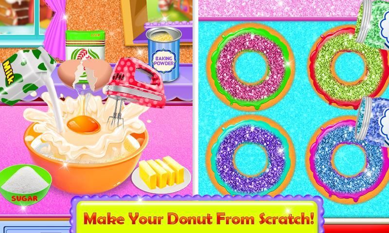 Welcome to the Sweet Glaze Donut Bakery: New Dessert Shop, a place where you can make some delicious and out of the box creations, Make and bake some new glowing donuts with sweet food items and melt into colors of rainbow & galaxy. Some necessary food items and essential ingredients required to make the delightful donuts, so the first step is to take a trip to the bakery ingredients shop. Make sure that you have bought the baking powder, flour, sugar, food colors, mixer, artificial flavors, fruits and other flavors or glaze and sprinkles for the final touch on the doughnuts. When you finished all the shopping related to your kitchen and donuts ingredients then, begin preparing food for baking doughnuts for your bakery shop. If you really want to learn making of sweet donuts in your own kitchen then this is the best Sweet Glaze Donut Bakery: New Dessert Shop game for the kids cooking lovers!