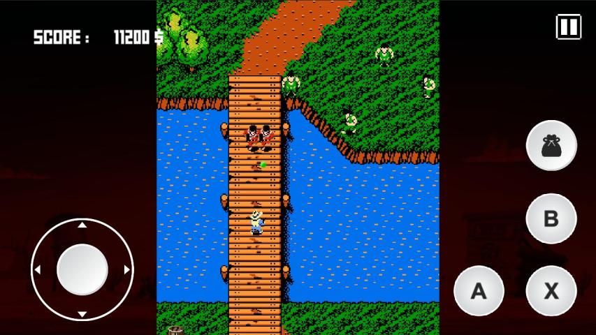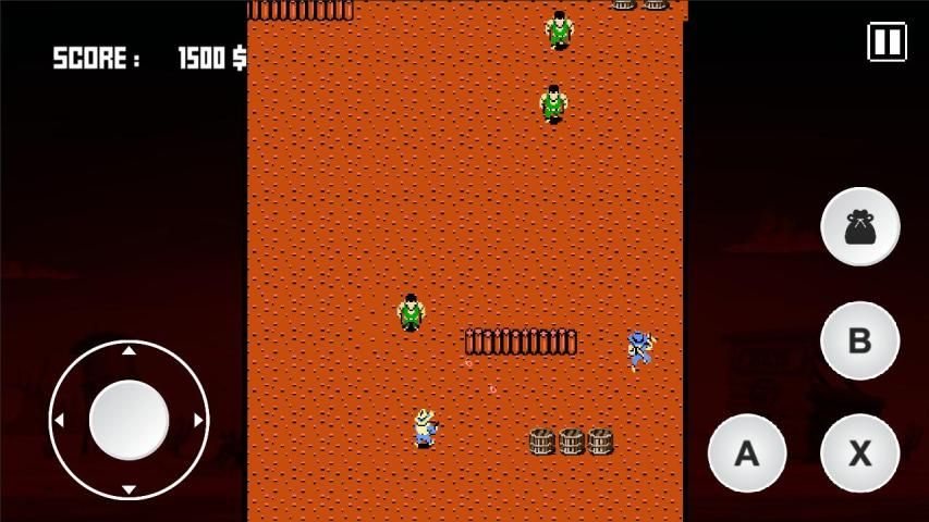 This game is a scrolling shooter in which the screen scrolls upward automatically and players only have three ways to shoot, using three buttons for left, right, and center shooting. The player can also change the way the gunman shoots through button combinations. The player dies by getting shot or struck by enemies, or by getting caught between an obstacle and the bottom of the screen. The player can collect special items, including a horse for protection up to three hits (or get killed by an obstacle), boots for speed of movement, bullets for faster shots and rifles for longer shot range. These items are found by shooting barrels and rifles, boots, and bullets can stock up to five. Some items that add score points include stars, bottles, bags, dragonflies, and cows, but two other items to watch out for are the yashichi, which is a 1up and the cattle skull, which reduces Billy's power.