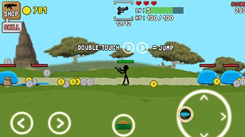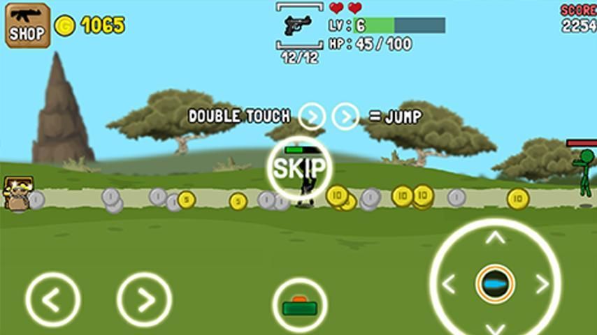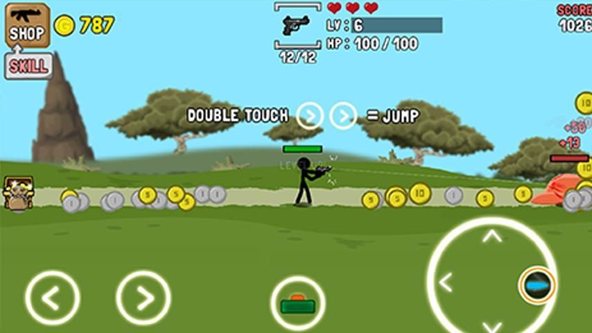 Sentuh layar atau gunakan joystick virtual untuk bergerak dan melompat dan Shoot.