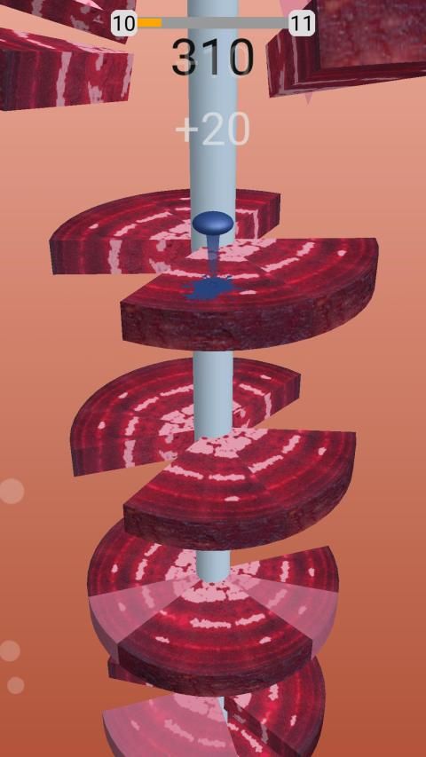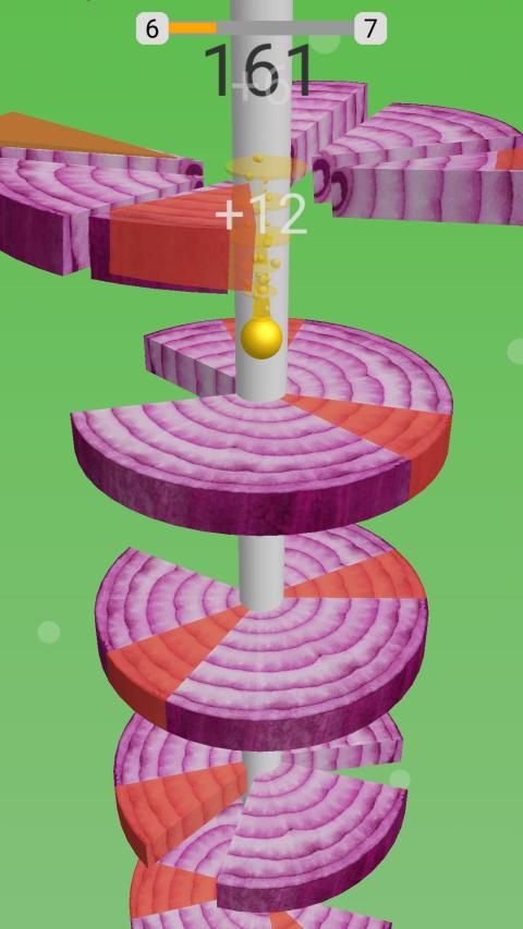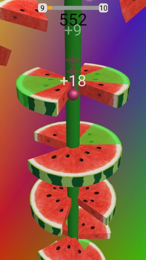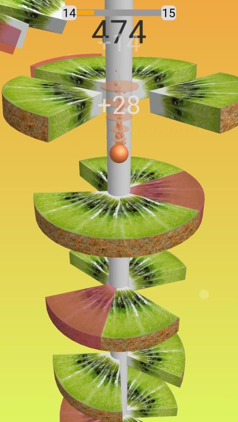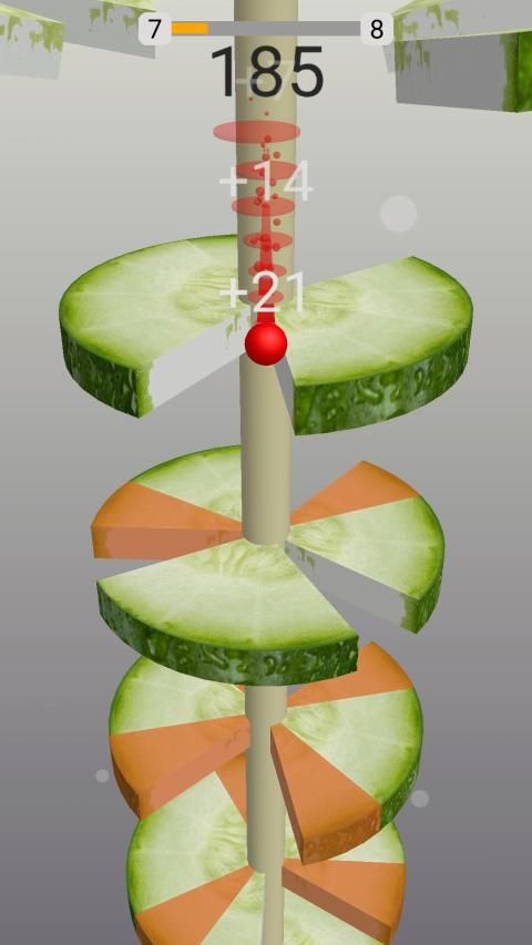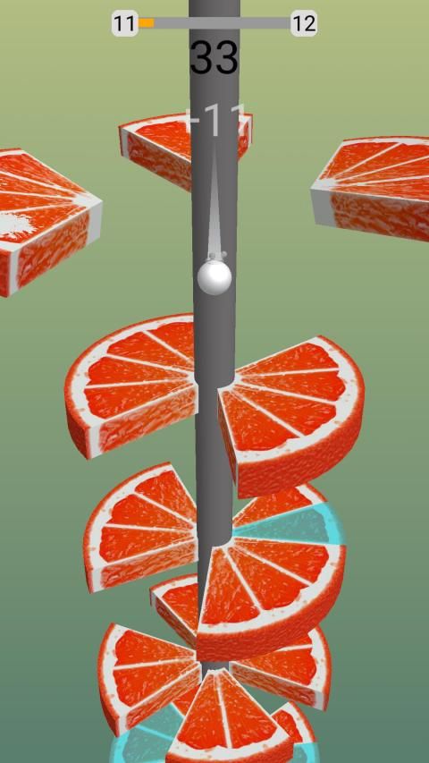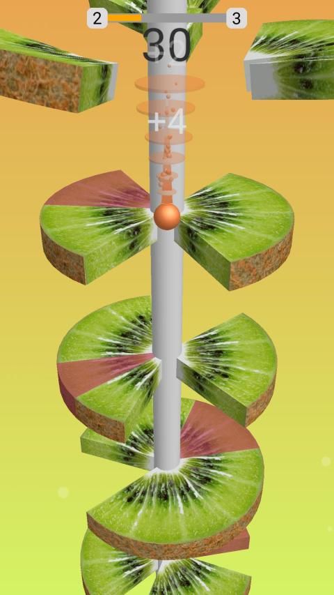 Pada helix ball jump Anda perlu menggesek layar dan memotong Buah menjadi beberapa bagian dengan mengirisnya dengan bola melompat Anda.