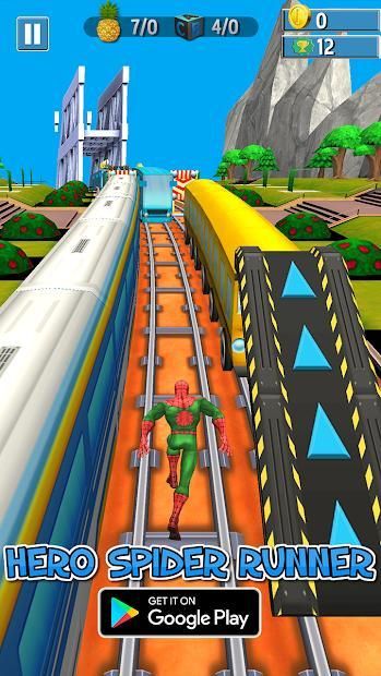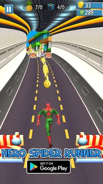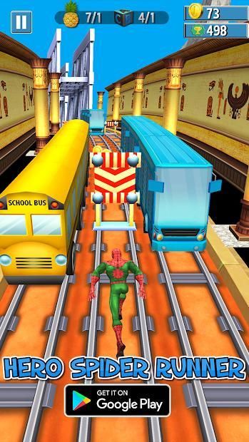 Hero SpiderBoy Runner is endles legend warior is very addictive game with very simple and easy game play. Strengthen him by collecting spiders, insects and hot dogs in his journey. Tap on screen for one jump and swept left and right to move . Help him to pass the Bus train and unlock all the achievements.
