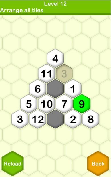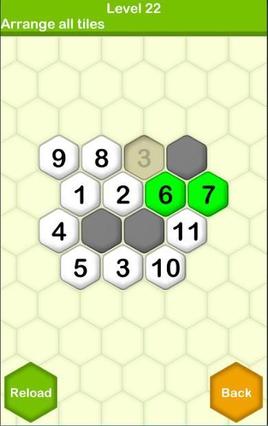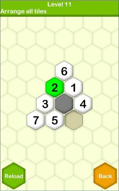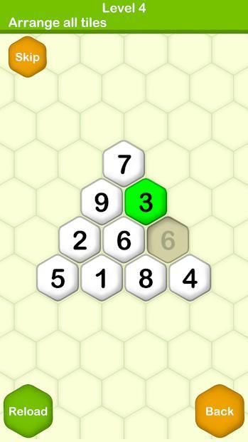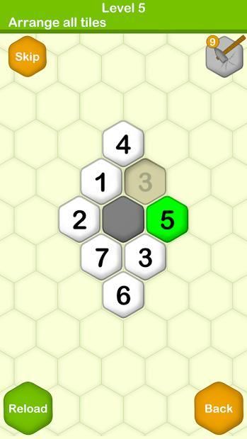 On the start a number of hexagon tiles are created and shuffled randomly, player rearrange all tiles and proceed to next level. The game uses the idea of basic number sorting game but in shape of hexagons. Hexa Puzzle level's become very challenging due to shape of tiles and obstacles.