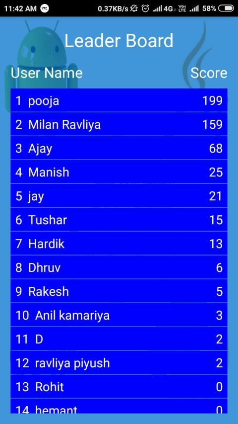 User can compare our score with the other users in Leader Board .It provide user name with score.