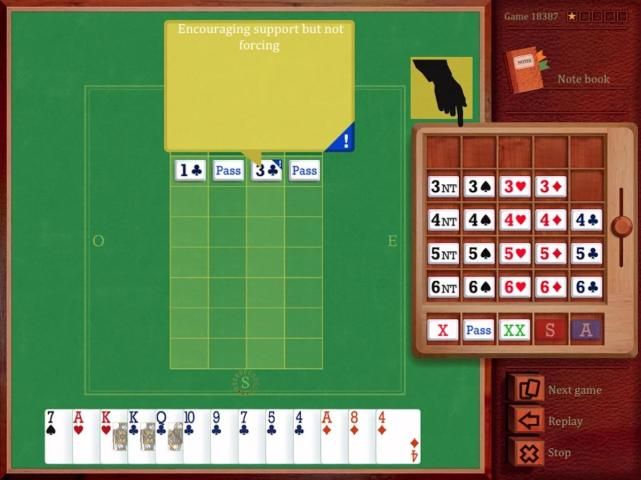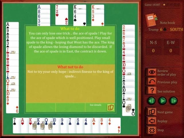 Aplikasi dengan mana Anda dapat bermain game (tingkat menengah) yang disiapkan oleh juara dunia, Dominique Pilon. Y'll dapat leanr dan merevisi teknik jembatan prinicpal: finessen langsung trumping dari tangan pendek, pengaturan setelan jas. Level 2 pada skala 1 sampai 5.