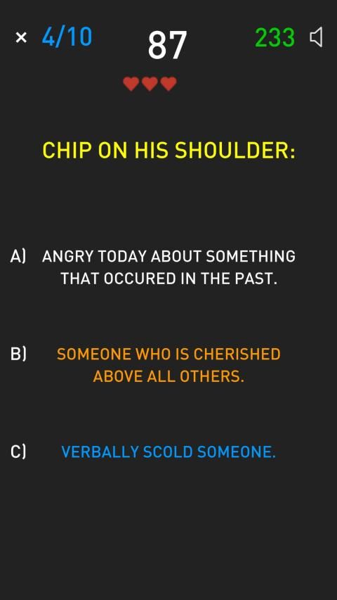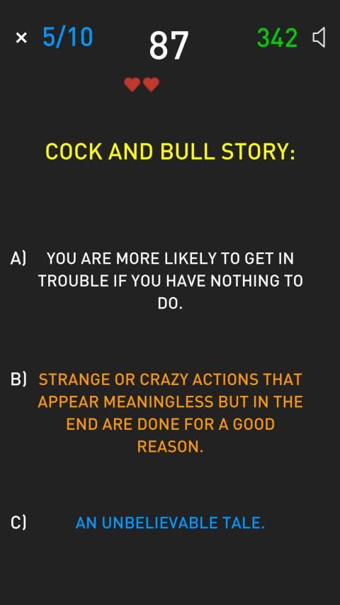 * 10 Rounds - Assign idioms to their correct explanations as fast as possible. 10 rounds + 5 lives available.