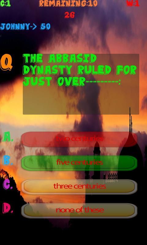 This Islam History game helps user to sharpening their knowledge and senses, help them to prepare for exams or tests which are based on all Aspects of Islamic History and helps them to increase their knowledge. This app targets people of all ages, even children could enjoy tests created by this app and could enhance their Islam History Knowledge. This app can be used for the preparation of School, Collage and Universities quizzes and also for entry tests.This app contains cool features like coloring the buttons green if the answer is correct otherwise coloring the button red because the answer is wrong. It provides multi-player functionality which enables you to play against the players around the world. It contains good graphics and less Ads. This app is extremely efficient, it is developed in such a way so that it could run smoothly in any android device.