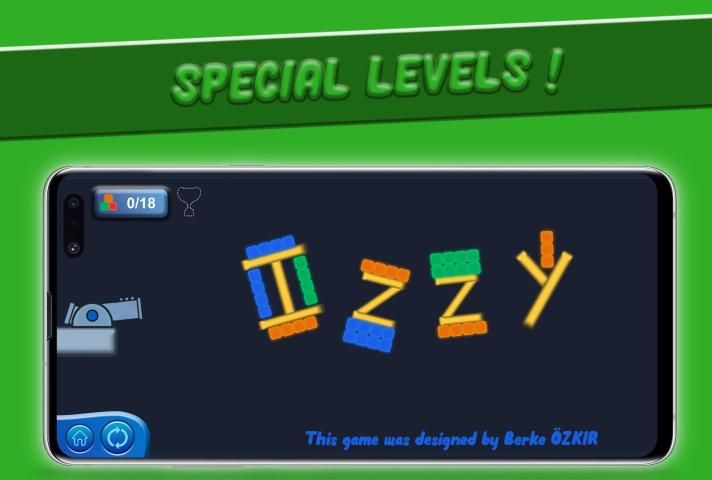 Izzy memungkinkan Anda bermain di antara 56 level kerajinan tangan yang berbeda dan menembak kotak dengan bola warna yang sama.