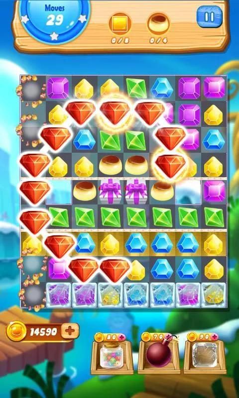 - Pertandingan 7 perhiasan Anda akan mendapatkan sebuah permata yang dapat menghilangkan perhiasan di row.Match sebuah 8 perhiasan Anda akan mendapatkan Bom Jewels yang dapat menghilangkan perhiasan di sekitarnya.