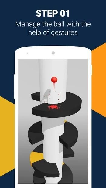 * Putar labirin heliks dengan menggeser jari Anda secara horizontal di layar Anda untuk memandu bola melompat melalui celah di menara helix.