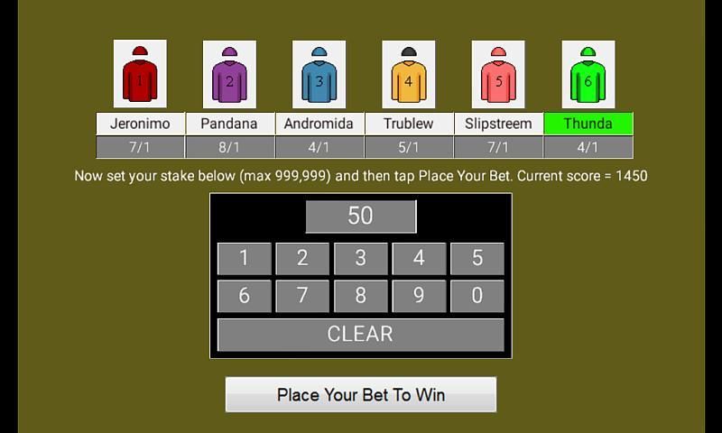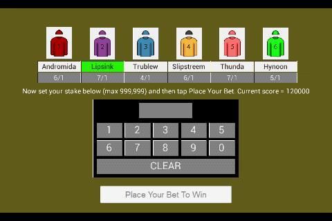 Bet in the thousands like the greedy rich but never lose a penny. Bets are in points not pounds so you can freely bet big on your favourite horse over 1200 metres and 8 hurdles. No in app purchases.