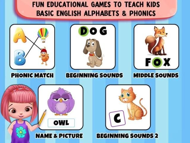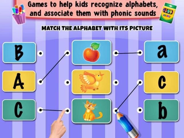 Balita, anak TK atau prasekolah anak usia dapat belajar bahasa Inggris dan abjad Inggris hanya. Ini fitur serangkaian permainan belajar bahasa Inggris untuk membantu anak-anak mengenali huruf, mengasosiasikan mereka dengan suara bunyi, dan menempatkan pengetahuan alfabet mereka untuk digunakan dalam menyenangkan pencocokan latihan.