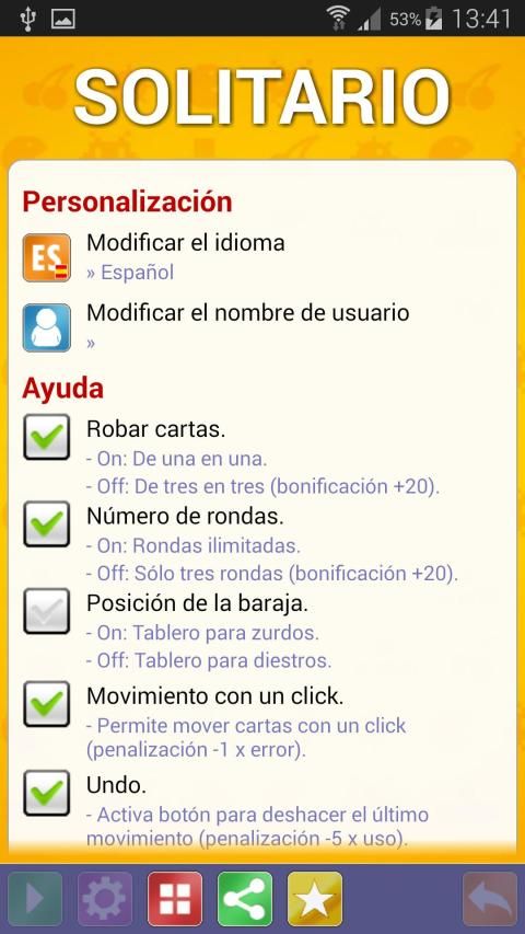 El entorno de juego, puede configurarse para facilitar la jugabilidad del solitario y adaptarse a nuestras preferencias o gustos.