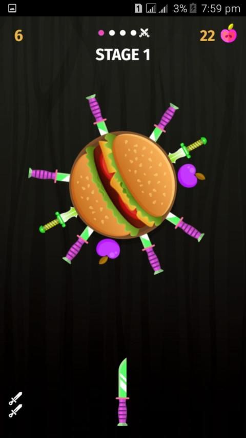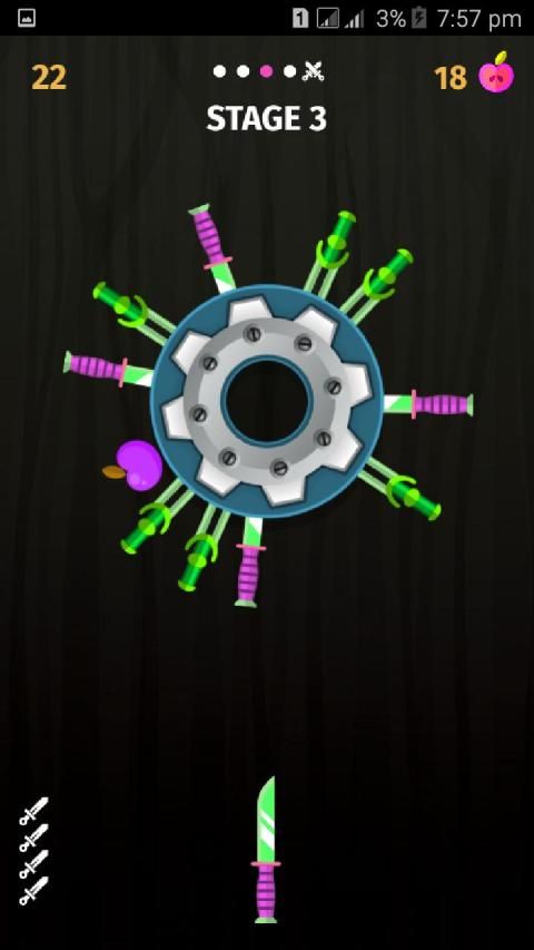 Objek berputar sebagai target bergerak, kadang-kadang sangat lambat dan di waktu lain dengan kecepatan yang dipercepat. Tujuan Anda adalah hanya menargetkan setiap bagian dari objek tanpa pisau yang ada di dalamnya.