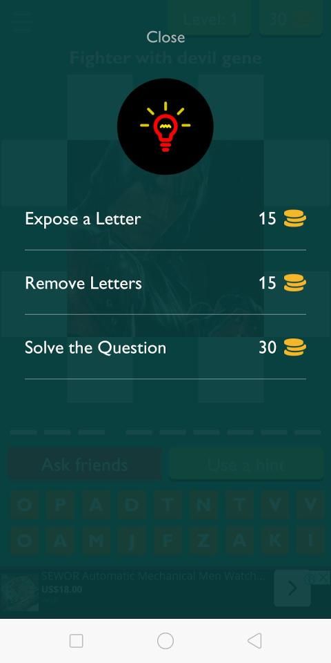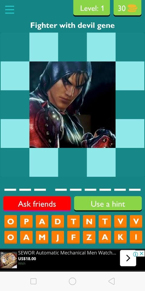Showing a picture as a clue for you to guess the name of that fighter. You fill in the right letters in the right space to pass each level. There are a few fighters from different games feature in the game.