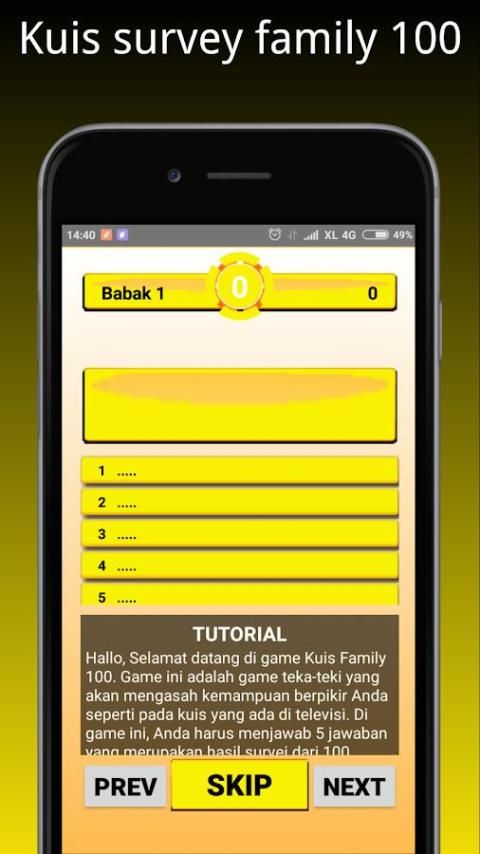 Anda akan menjawab pertanyaan yang dimana jawaban atas pertanyaan tersebut didapatkan dari hasil survey 100 orang. Jawaban yang muncul akan berhubungan dengan jumlah poin dari jumlah orang yang menjawab pada saat survey dan akan muncul di papan jawaban. Pertanyaan dan jawaban dalam permainan ini sebagian besar disadur dari permainan New Famili 100 yang saat ini tayang di TV Indonesia.