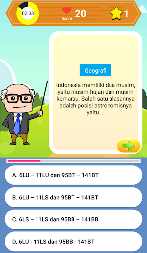 Kuis cerdas cermat ini adalah pilihan tepat untuk kamu yang ingin mengikuti ujian semester, Ujian Nasional (UN), Ujian Nasional Berbasis Komputer (UNBK), atau bagi kamu yang ingin yang mengikuti Seleksi Nasional Masuk Perguruan Tinggi Negeri (SNMPTN).