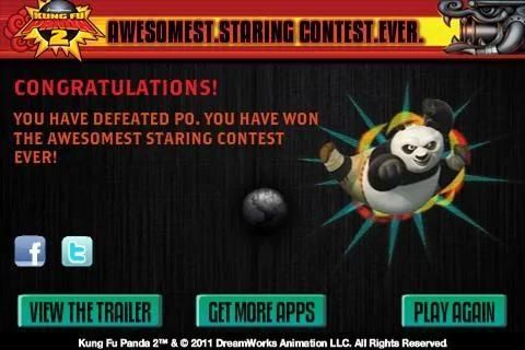 Challenge Po (the hero of Dreamworks’ Kung Fu Panda 2) in the most intense martial arts staring contest the world has ever seen. Think you can defeat the Dragon Master? It will take all of your skill and cunning to break Po’s focus in this hilarious eye-to-eye combat simulator. Get ready. Kung Fu Staring Contest… GO!