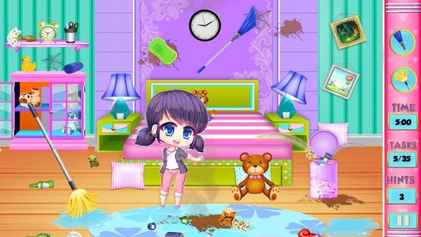 Kemarin boneka-boneka itu mengadakan pesta untuk teman-temannya. Jadi rumah impian mereka dalam kondisi berantakan. Boneka wanita pahlawan besar butuh bantuan Anda. Jadi bersihkan kamar dengan spick and span. Yang harus Anda lakukan adalah membersihkan barang-barang limbah dan menempatkannya di tempat sampah. Anda akan dipuji karena membantu kucing dan serangga Surprise yang putus asa.