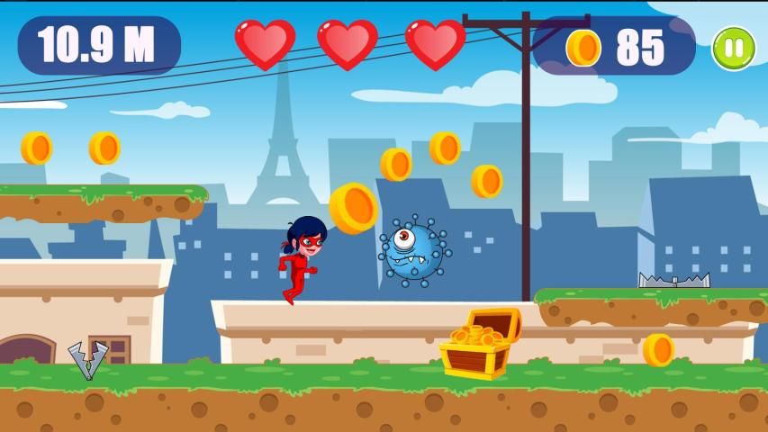 Anda mulai bermain sebagai Cat Noir Dan Kepik Games, Mulai menyentuh untuk melompat dan membuat panjang melompat untuk melewati obstacoles dan peselancar dengan ladybug megah